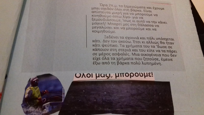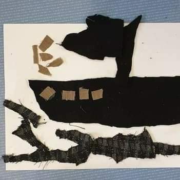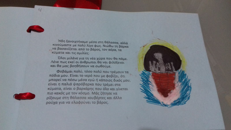 Σε ρολό από καφέ ή άσπρο χαρτί, τοποθετούν κομμάτια με υφάσματα για να φτιάξουν μια εικόνα του βιβλίου. Μπορεί να είναι ένας διάλογος ή απλά μια σκηνή με τη βάρκα ή στην παραλία όταν η βάρκα γίνεται χώρος παιχνιδιού.